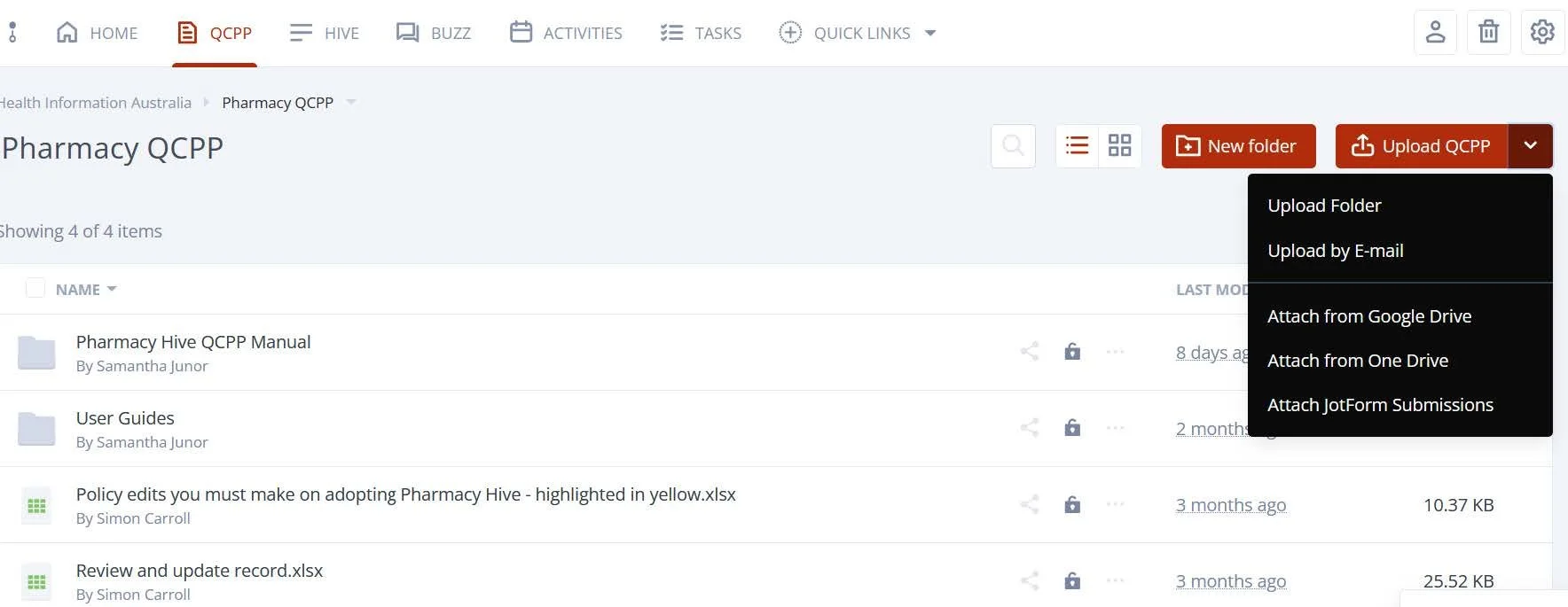 You can connect your Google account with Pharmacy Hive and make Google files available from within the QCPP section of your Pharmacy. Navigate to your QCPP section of the relevant Pharmacy, then choose "Attach from Google Drive" from the "Upload File(s) menu in the upper right corner.
