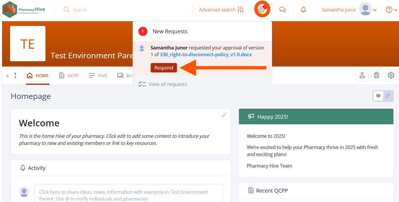 A 'Requests' dropdown link will also appear in your top bar and a notification will inform you of the amount of requests you have to respond to. Click on this to respond.