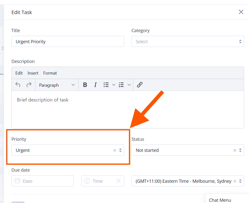 To set a task priority, click on a task from the task list or create a new task. Then simply set a priority, e.g. low/medium. Note that the priorities can be altered at any point in time by clicking into the edit option for a task. Once selected you will see the priority as a coloured arrow next to the task.
